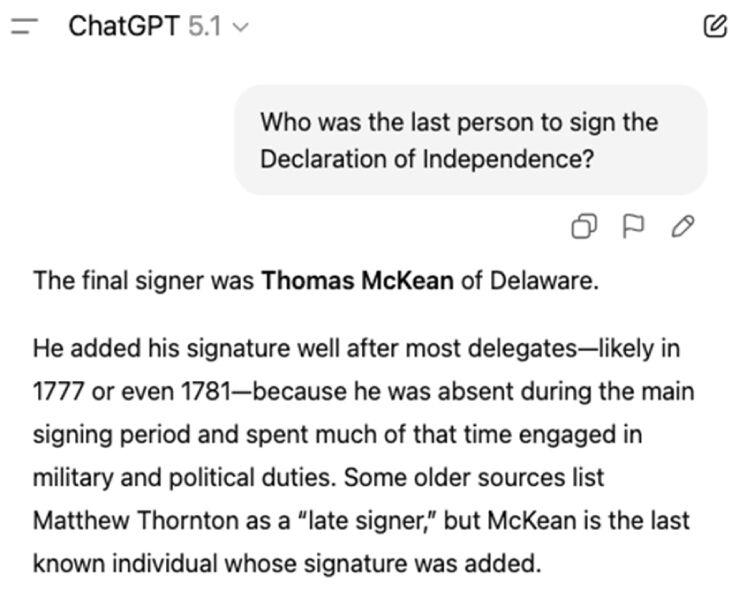Now, please don’t get me wrong. It’s a useful tool under the right circumstances. If I want to know basic facts like, say, who signed the Declaration of Independence last, I can be reasonably confident in its response: