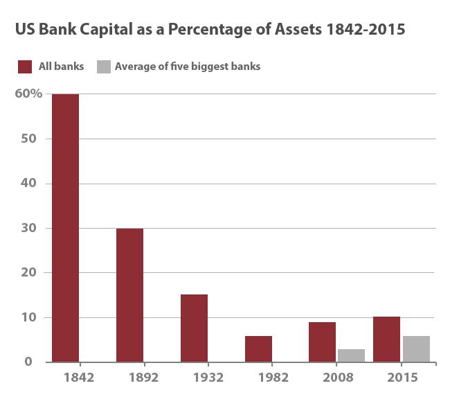 Historically, US banks were much better capitalized, with an average capital ratio of 60% in 1842. This is ten times higher than today’s largest banks. That was an era in which bank competition was based on safety, because no deposit insurance was in effect.